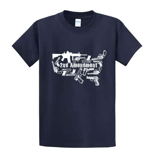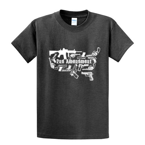 Show your support for the 2nd Amendment with this shirt featuring different weapons laid out in the shape of the US.