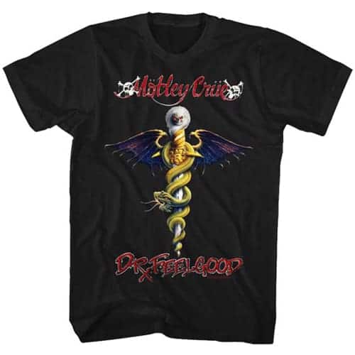 Motley Crue is one of the most influential heavy metal bands of all time. This shirt features the caduceus that appears on the cover artwork for the band's fifth studio album Dr. Feelgood.